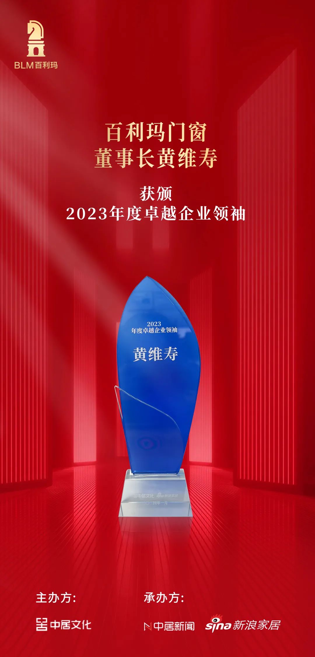 此次评选活动旨在表彰为中国家居行业发展做出杰出贡献的优秀品牌及领军人物,见证中国家居品牌力量,树立行业标杆。黄董凭借对门窗行业的卓越贡献与引领力量,荣获“2023年度卓越企业领袖”,以专业、匠心的精神获得行业及消费者认可,以榜样力量推动行业高质量稳健发展。
