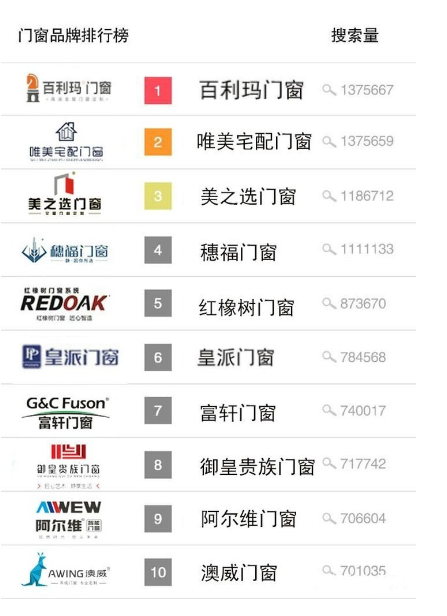 2023最具影响力门窗十大品牌上榜的有:1、百利玛门窗;2、唯美宅配门窗;3、美之选门窗;4、穗福门窗;5、红橡树门窗;6、皇派门窗;7、富轩门窗;8、御皇贵族门窗;9、阿尔维门窗;10、澳威门窗。
