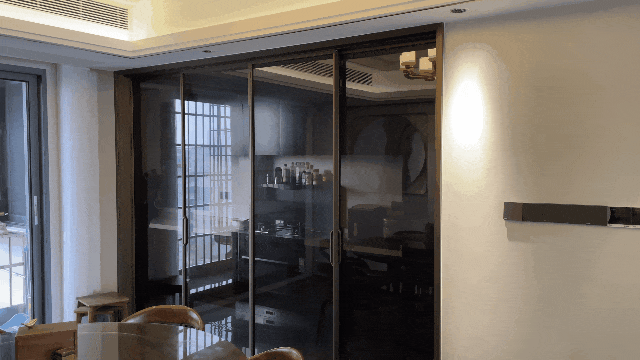 餐厨空间以简约时尚推拉门作隔断,彰显优雅生活的自由和舒适,百利玛系统推拉门让空间视觉感更加开阔,引进自然光线,提升餐厨区域的通透性及明亮度,让居住者在此尽情享受美食与相聚的快乐。
