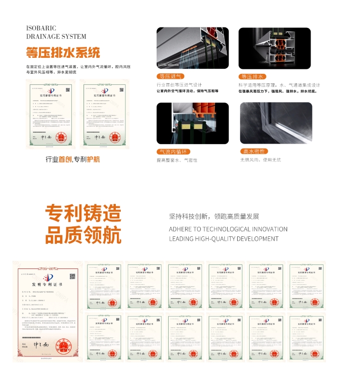 作为行业安全门窗标杆级制造企业,百利玛始终不遗余力地专注推进门窗安全技术的升级。目前已经拥有百余项专利认证,其中行业首创专利技术“等压排水系统”引领安全门窗新高度。