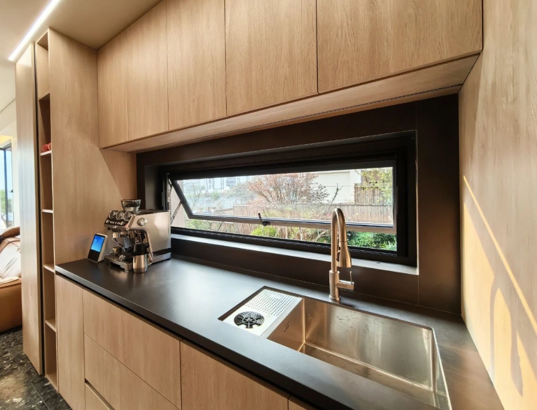 厨房应用外开上悬窗,它既可以外开,又可从上侧推开。此窗型的防雨性较好,在实现室内良好通风,同时也能有效地将雨水阻挡在外。