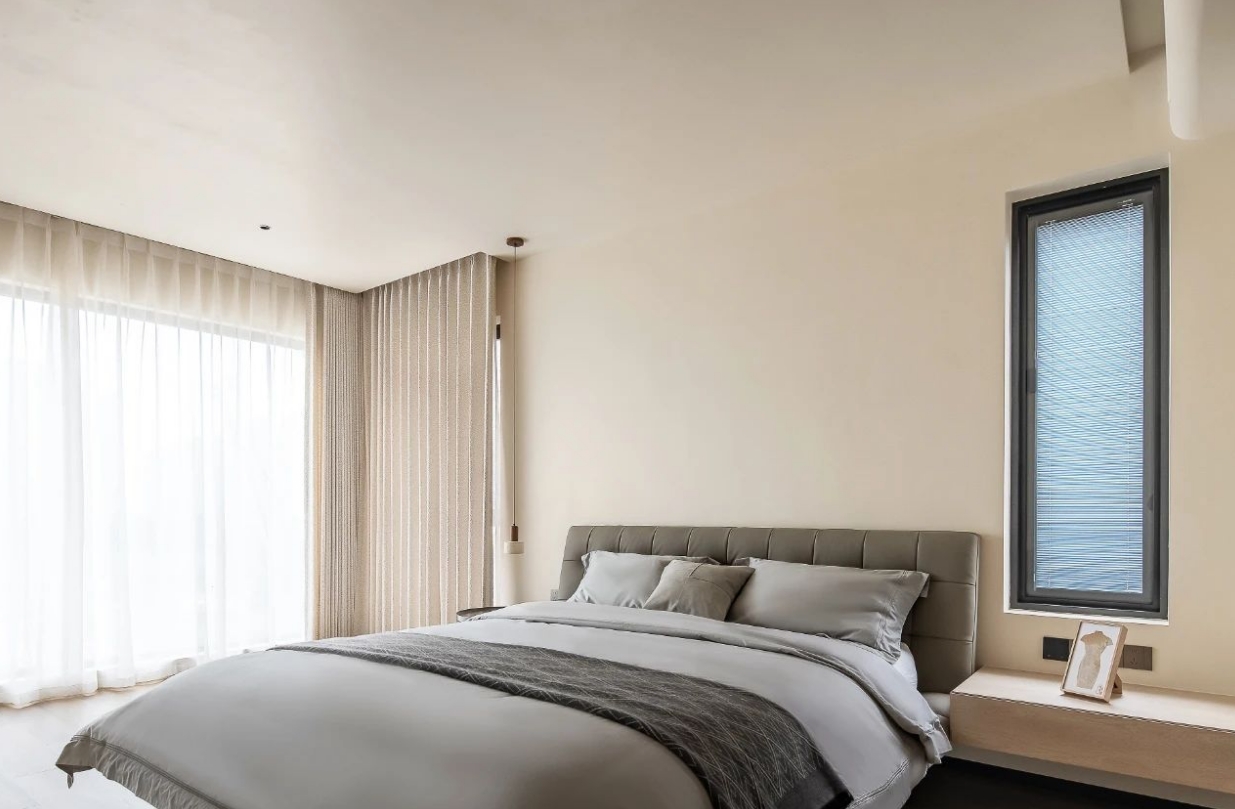 卧室空间延续整体简素基调,简约门窗设计,融合一体式的家具设计,让空间更显清新简练,原木色舒适恬静,晕染柔和自然光线,给人岁月静好的感受。