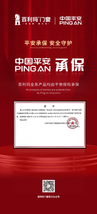 为了保障消费者权益,营造更加安全的购买和使用环境,百利玛连续4年与世界500强中国平安保险公司达成合作,投保全系列产品责任险,用户在承保范围内如因百利玛门窗的质量导致人身伤亡、财产损失的均可获得理赔,让品质安全更放心!