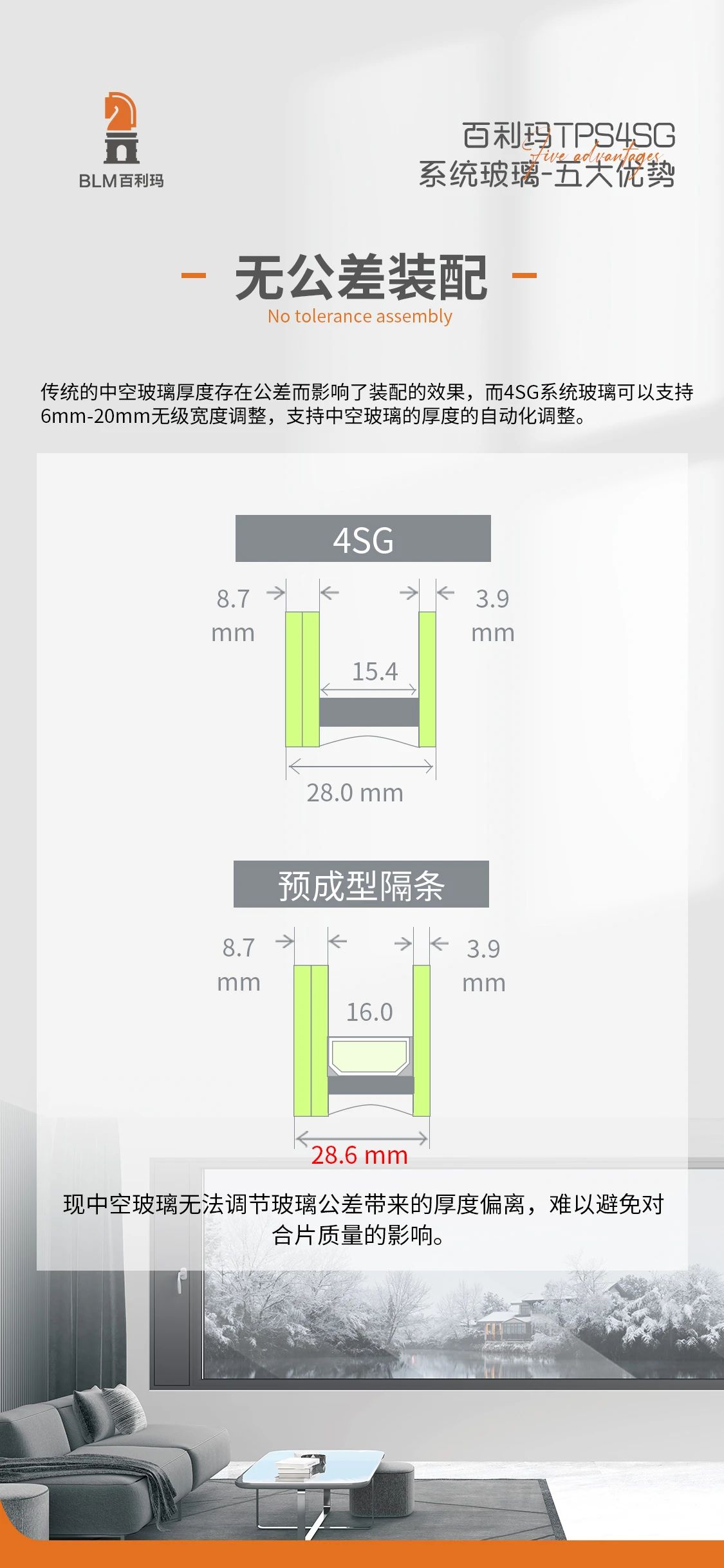 百利玛TPS 4SG玻璃将科技与艺术完美融合,通过先进的自动化设备精确控制隔热条位置,使每一块玻璃都呈现出极致的外观效果,为您的家居生活增添一抹亮色。