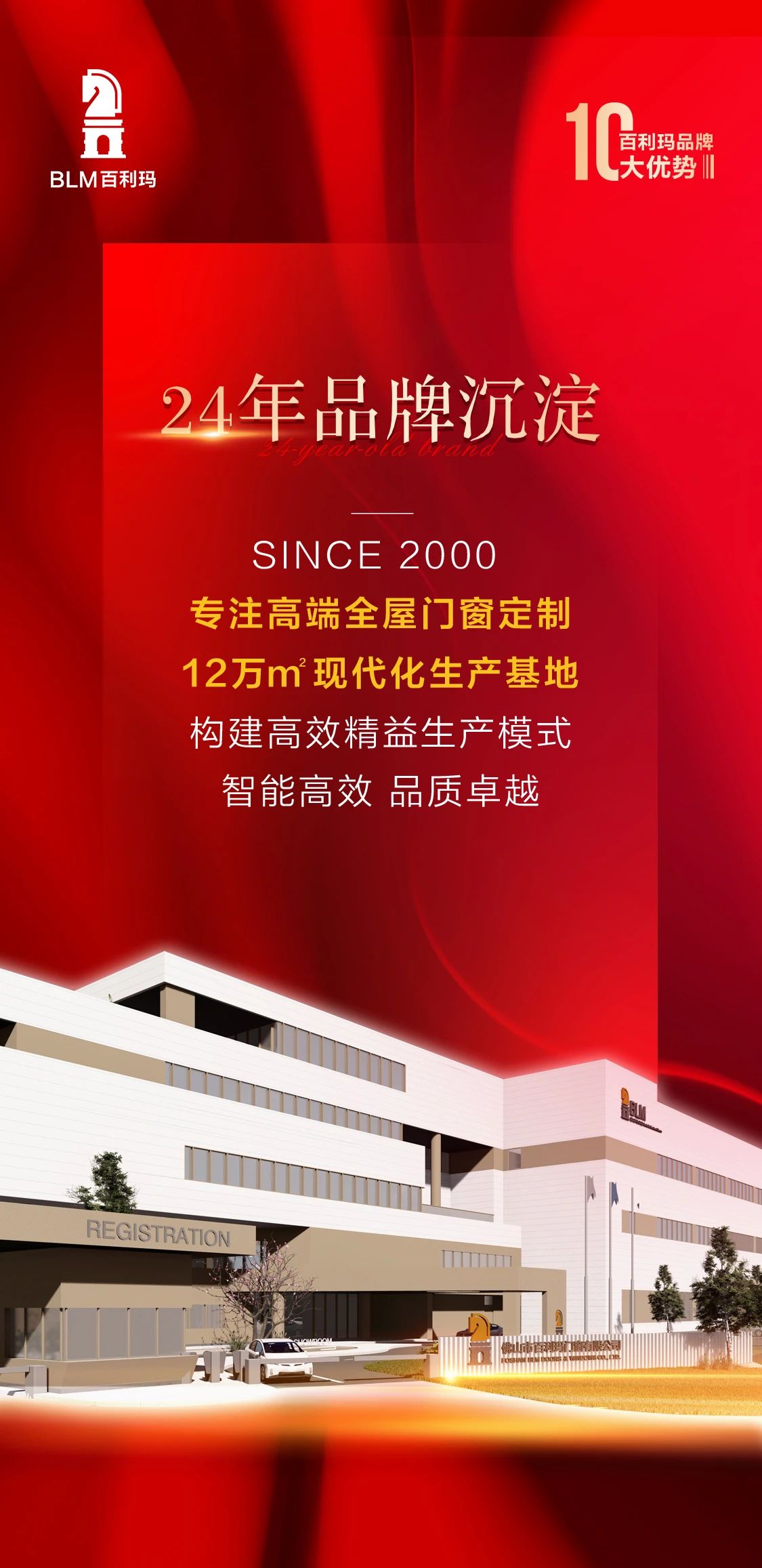 自2000年成立以来,百利玛门窗已深耕行业24载。我们专注于高端全屋门窗定制,拥有12万m²的现代化生产基地和法式轻奢体验馆,构建高效精益生产管理模式,从制造生产到智能交付,全力保障客户需求。