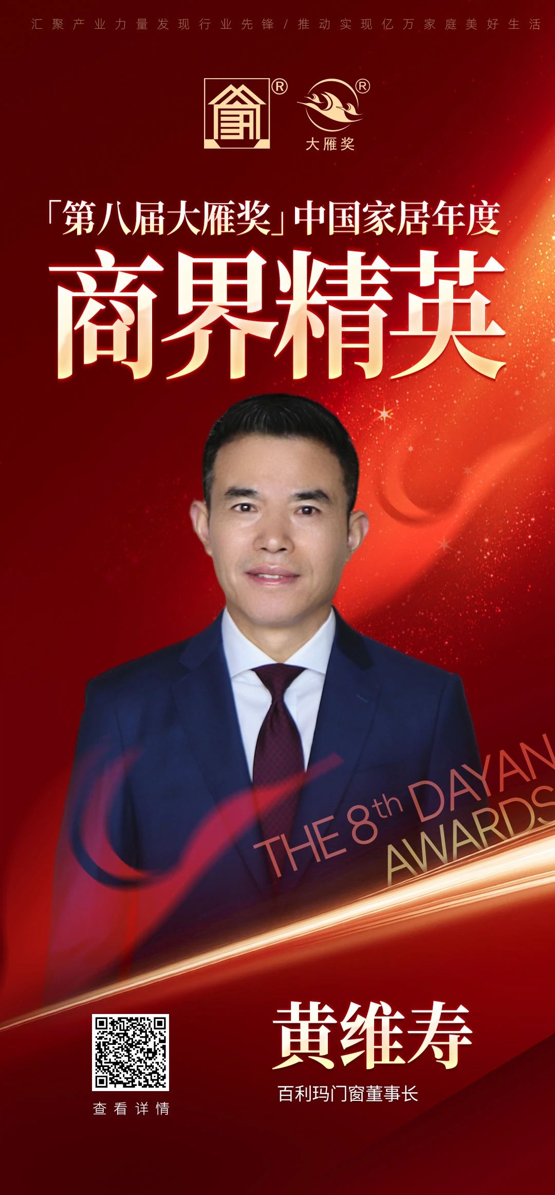作为中国系统门窗行业领军企业家,门窗十大品牌百利玛门窗董事长黄维寿先生受邀出席盛典活动,凭着在行业影响力、行业贡献、个人能力价值三大维度中的突出优势,从上百家居人物中脱颖而出,荣获“中国家居年度商界精英”称号,彰显其对行业发展的贡献和时代榜样的力量。