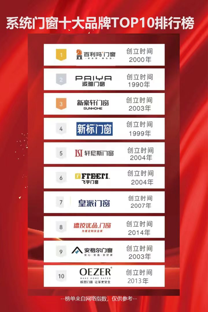 2024年,系统门窗行业出现了不少优秀的品牌,这些品牌厂家实力雄厚、门窗设计专业、制作工艺严谨、售后服务贴心,其中最令人瞩目的要数系统门窗十大品牌,排行榜不仅综合了行业的数据,更结合了消费者和加盟商意见,综合评选出最优秀的前十名,让我们一起了解下2024年最新公布的系统门窗十大品牌排行榜。