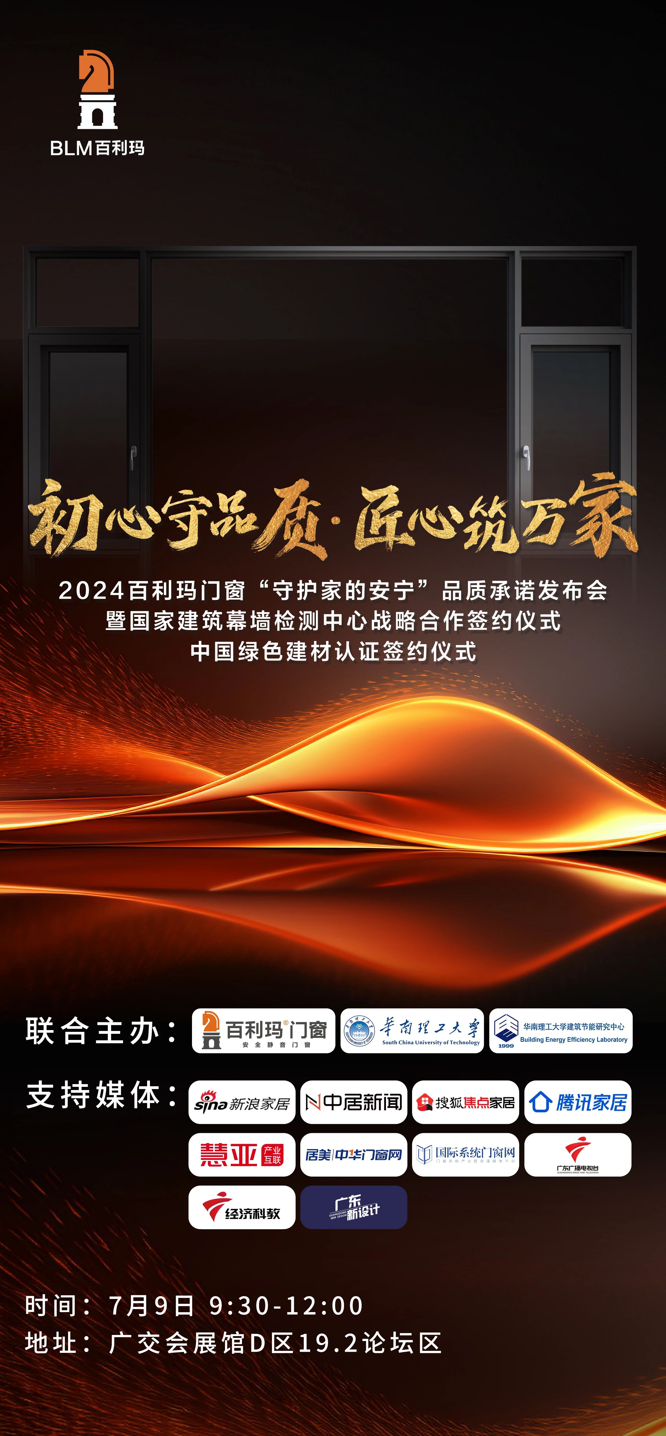 7月9日,百利玛门窗“守护家的安宁”品质承诺发布会暨国家幕墙检测中心战略合作签约仪式将隆重举行,将在广交会展馆D区19.2号馆论坛区举行,以品质和服务双引擎,开启高品质门窗新未来,敬请期待!