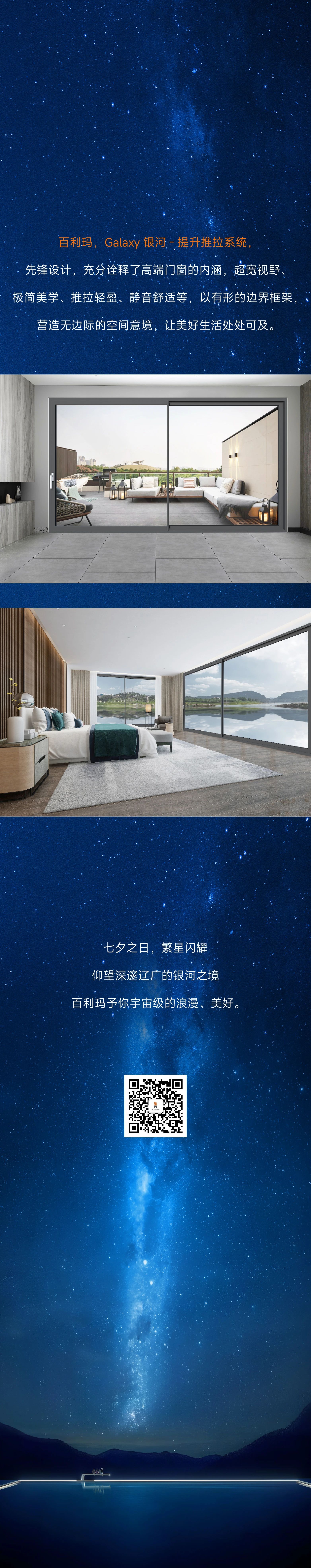 百利玛,Galaxy 银河-提升推拉系统,先锋设计,充分诠释了高端门窗的内涵,超宽视野、极简美学、推拉轻盈、静音舒适等,以有形的边界框架,营造无边际的空间意境,让美好生活处处可及。