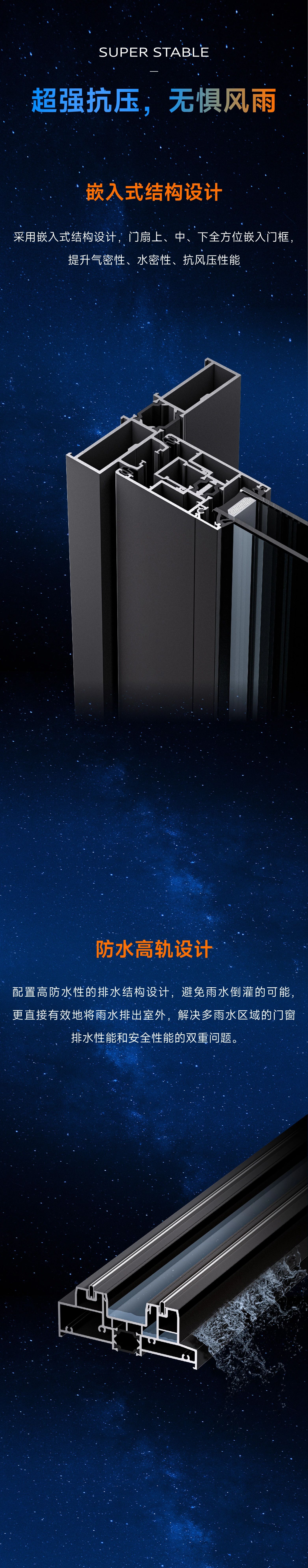 采用嵌入式结构设计,门扇上、中、下全方位嵌入门框,提升气密性、水密性、抗风压性能