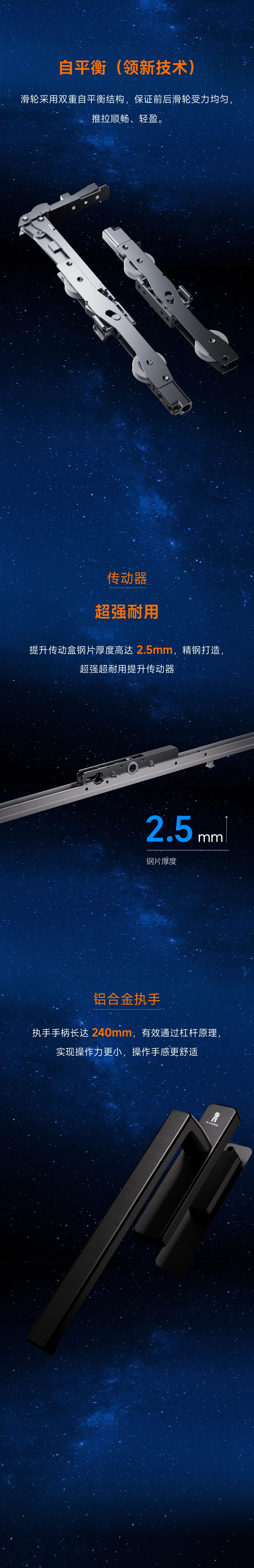 Galaxy-银河-提升推拉系统整体采用高品质提升五金系统,超强性能,坚固耐用,颜值出众,更好提升门窗整体性能,长效守护您的舒适生活。