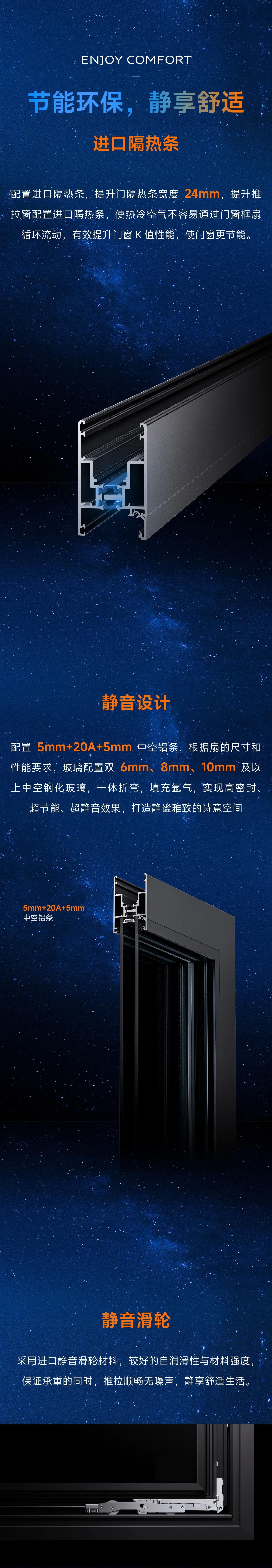 配置进口隔热条,提升门隔热条宽度 24mm,提升推拉窗配置进口隔热条,使热冷空气不容易通过门窗框扇循环流动,有效提升门窗K值性能,使门窗更节能。