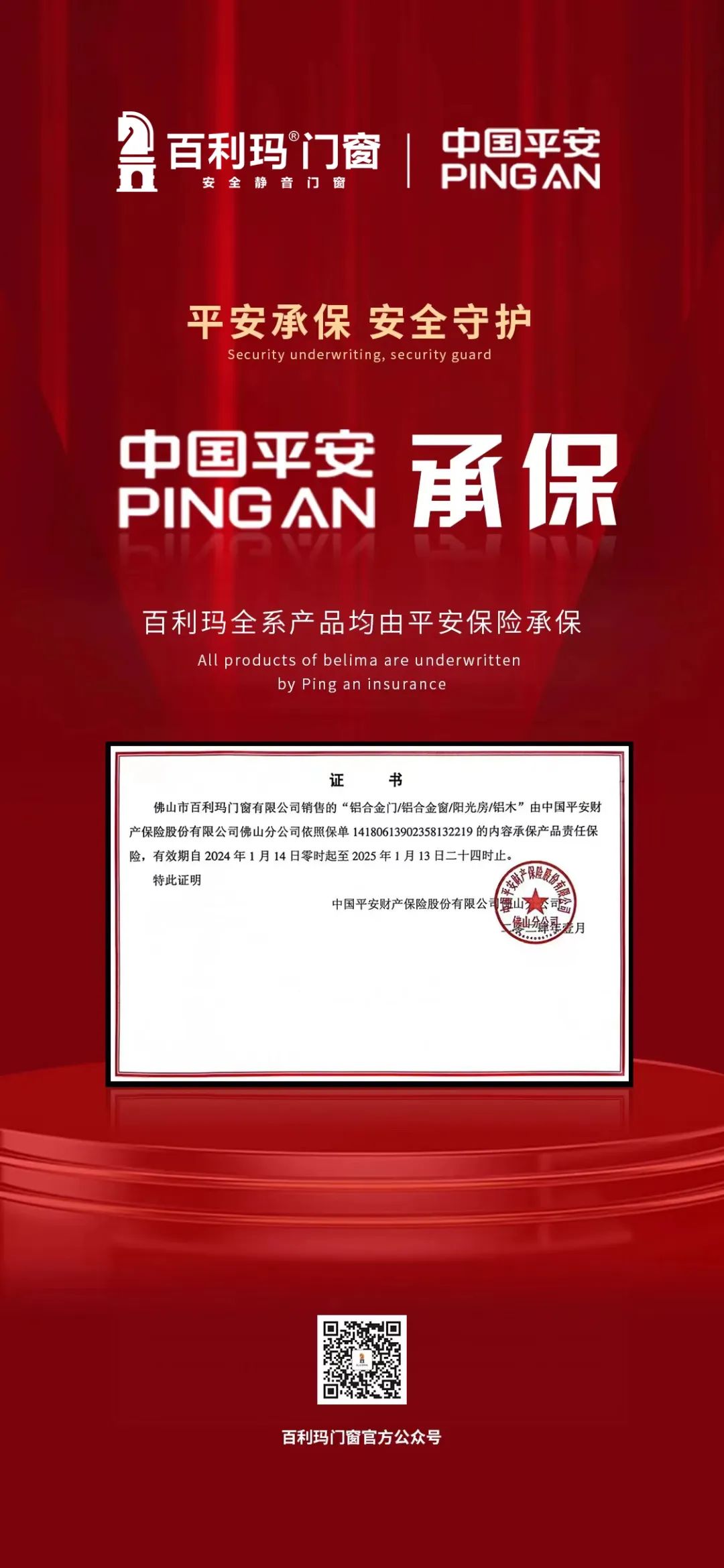 为了保障消费者权益,营造更加安全的购买和使用环境,百利玛连续4年与世界500强中国平安保险公司达成合作,投保全系列产品责任险,用户在承保范围内如因百利玛门窗的质量导致人身伤亡、财产损失的均可获得理赔,让品质安全更放心!