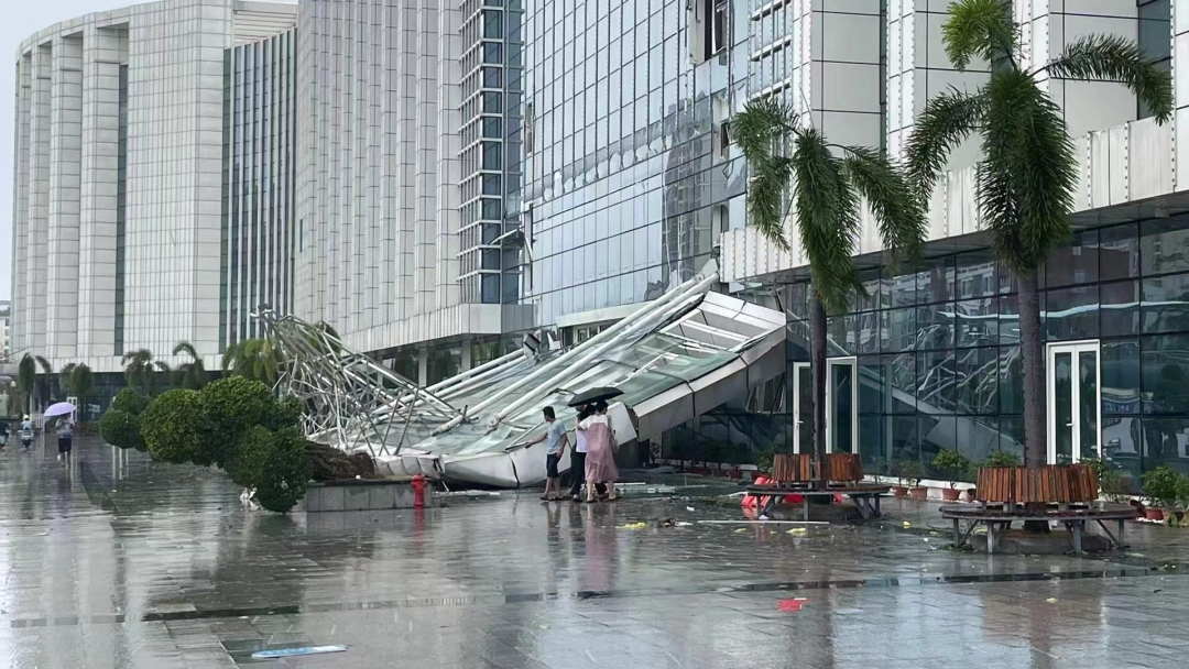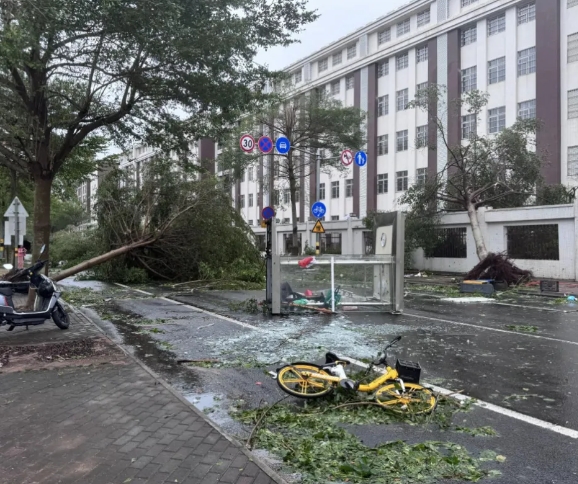 台风“摩羯”吹翻居住楼小区门窗及树木