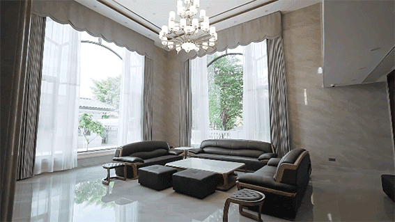 东方礼序精粹的每个细节,藏于生活场景的细微处,从进入府门之时便能感受到。挑高客厅,阔绰方正,设计上巧妙应用大面积落地窗,把自然光引进来,让居者沐浴在阳光和自然之中,实木茶座与庭院绿植相呼应,为这里增添了一份静谧与雅致。