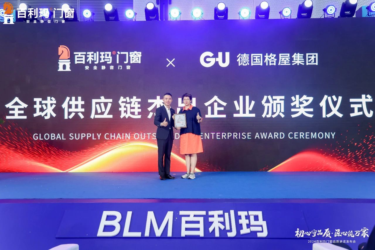 在品质承诺发布会上,德国格屋集团凭借其卓越的产品质量和长期稳定的合作关系,荣获百利玛门窗颁发的“全球供应链杰出企业”证书。这一荣誉不仅是对格屋集团高品质、高耐用性产品的认可,也彰显了双方在系统门窗领域深度战略合作的重要成果,共同致力于为全球用户提供更优质、更安全的门窗产品。