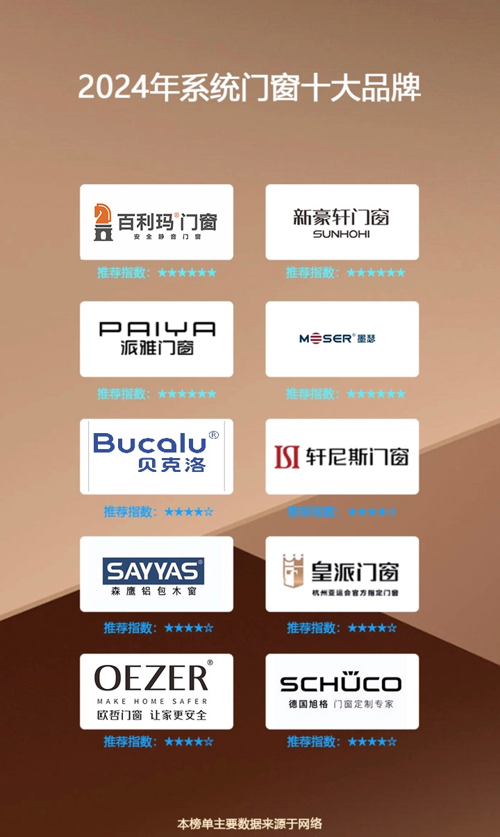 全国系统门窗十大品牌(2024公认最新排行榜):百利玛门窗、新豪轩门窗、派雅门窗、墨瑟门窗、贝克洛门窗、轩尼斯门窗、森鹰门窗、皇派门窗、欧哲门窗、旭格门窗(排名不分先后)。
