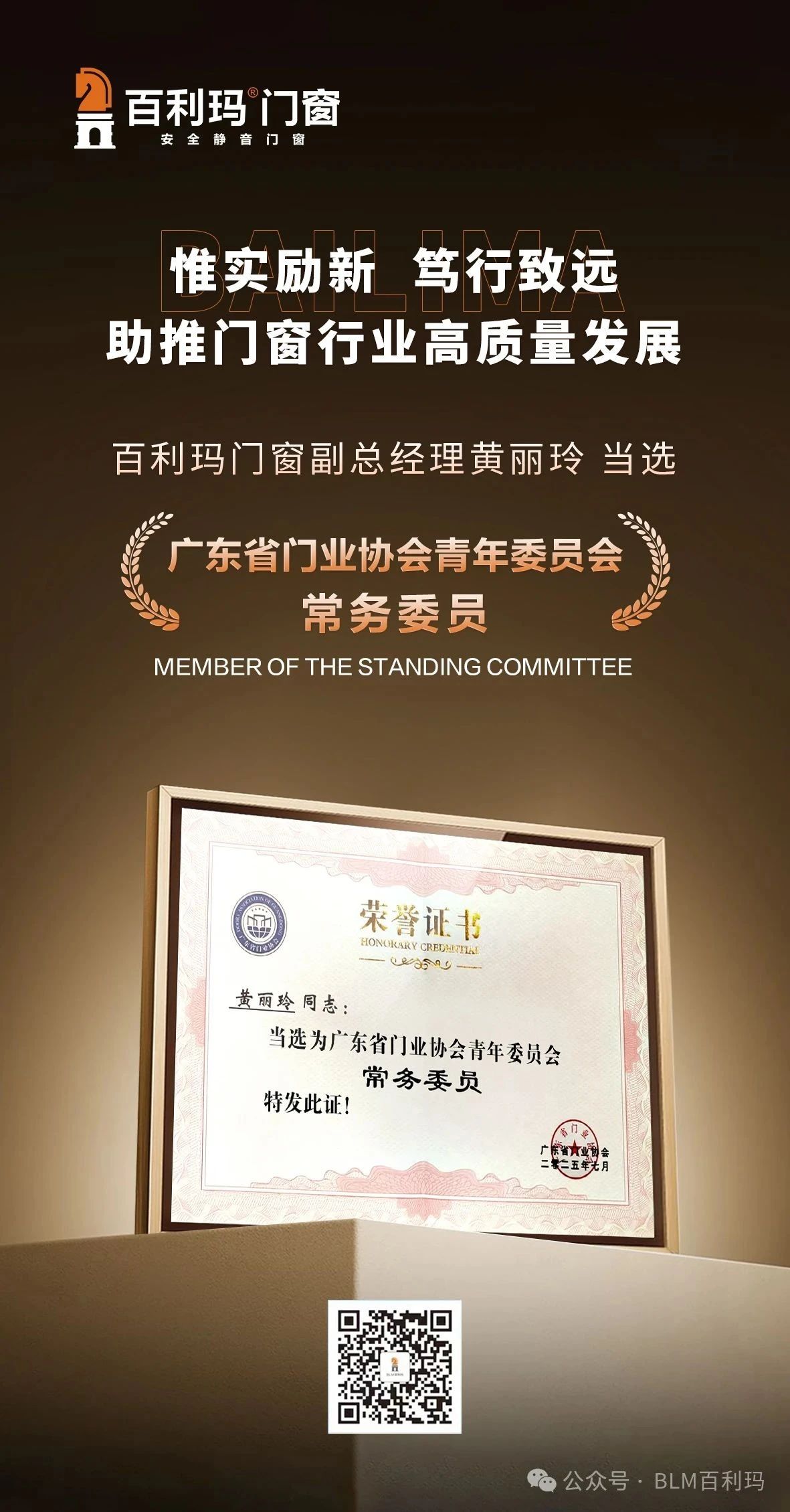载誉加冕,砥砺前行。会上,百利玛门窗副总经理黄丽玲凭借卓越领导力与前瞻视野,荣膺“门窗行业青年领袖”称号,并当选“广东省门业协会青年委员会常务委员”!这一荣誉不仅是对其个人能力的认可,更彰显了百利玛在行业创新与青年领袖培育中的标杆地位。