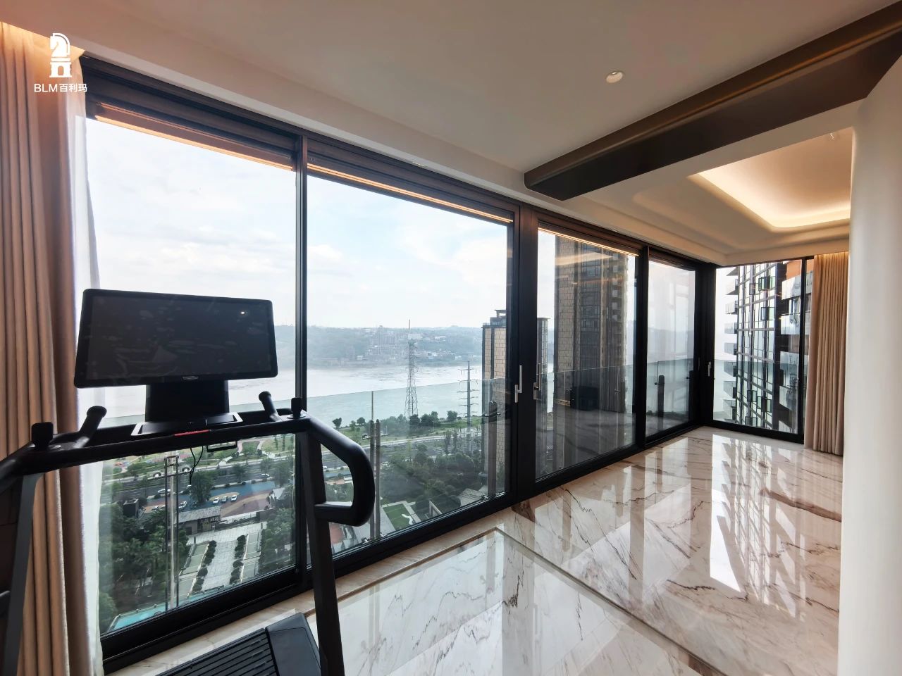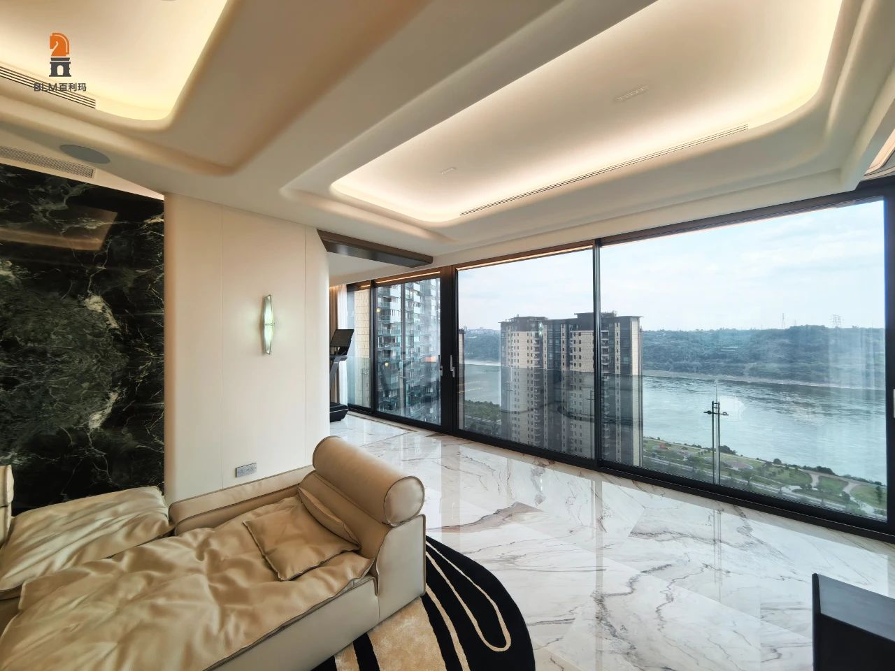 客厅接待区巧妙应用百利玛兰亭系统窗,以其内外框扇齐平的设计,展现了极致的简约与雅致,超大玻璃窗宽度约为6米,不仅为室内引入了无尽的自然光线,更将室外美景尽收眼底,营造出一种开阔、明亮的视觉享受。
