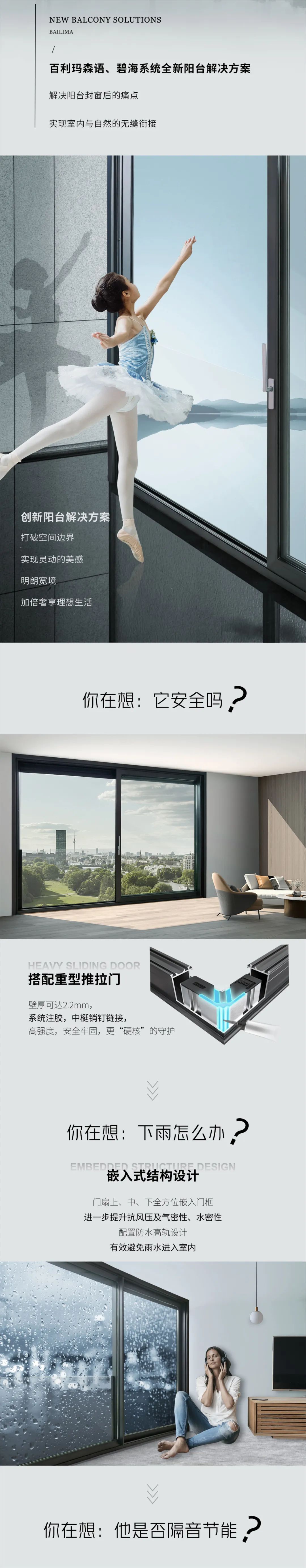 百利玛系统门窗,对传统阳台空间的一次变革,有人说:阳台封窗,让人犹如困在家的笼子,有人说:阳台封窗,让隔断了自由的灵魂。高定阳台的N种打造方式,封阳台你只知道用落地窗? NO!创新阳台空间的N种方式来了!百利玛森语、碧海系统全新阳台解决方案,解决阳台封窗后的痛点,实现室内与自然的无缝衔接。创新阳台解决方案打破空间边界,实现灵动的美感,明朗宽境,加倍奢享理想生活。