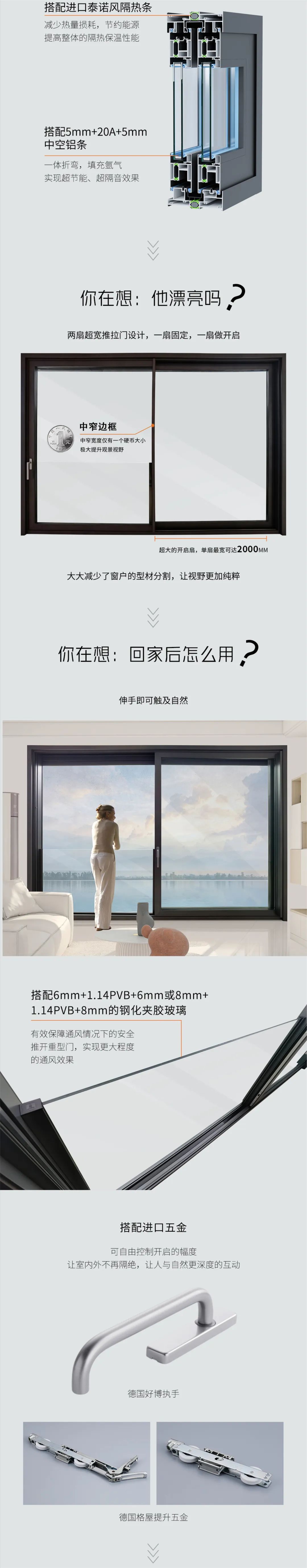 两扇超宽推拉门设计,一扇固定,一扇做开启,中窄边框,中窄宽度仅有一个硬币大小极大提升观景视野,超大的开启扇,单扇最宽可达2000MM,大大减少了窗户的型材分割,让视野更加纯粹。