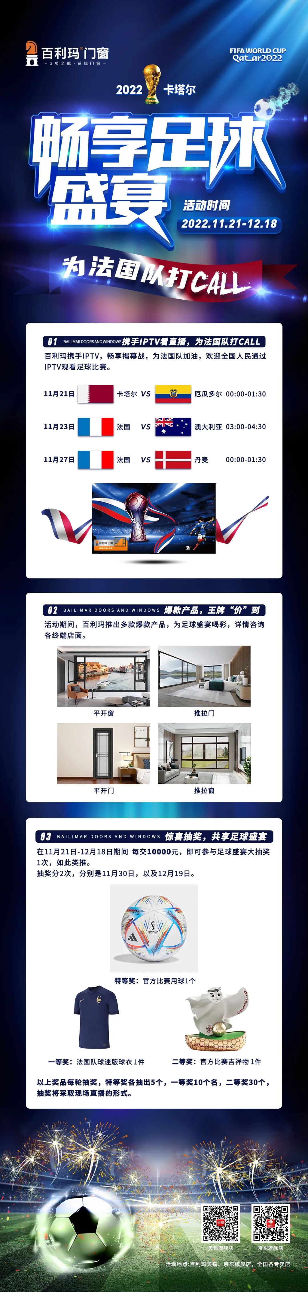 11月27日凌晨,法国2比1击败丹麦,法国队两连胜后提前从D组出线,成为本届世界杯第一支晋级淘汰赛的球队。百利玛系统门窗携手IPTV登陆CCTV5世界杯赛事,为法国队打CALL!