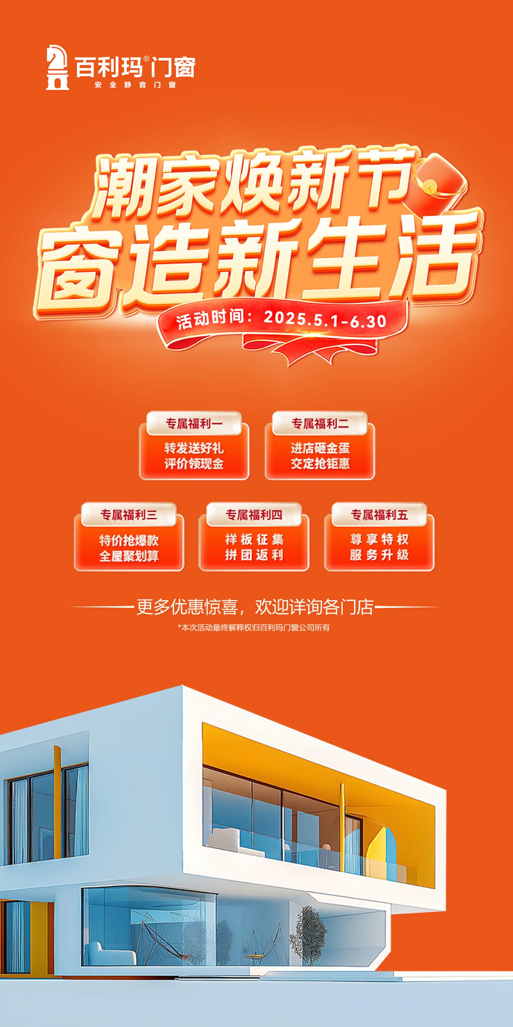 春风送暖焕新季,五一黄金时节,门窗十大品牌百利玛倾情推出「潮家焕新节·窗造新生活」全国钜惠活动。5月1日至6月30日,我们推出五重福利,政府补贴叠加品牌让利,多重优惠助力品质升级。诚邀您焕新品质门窗,开启舒适人居新体验。