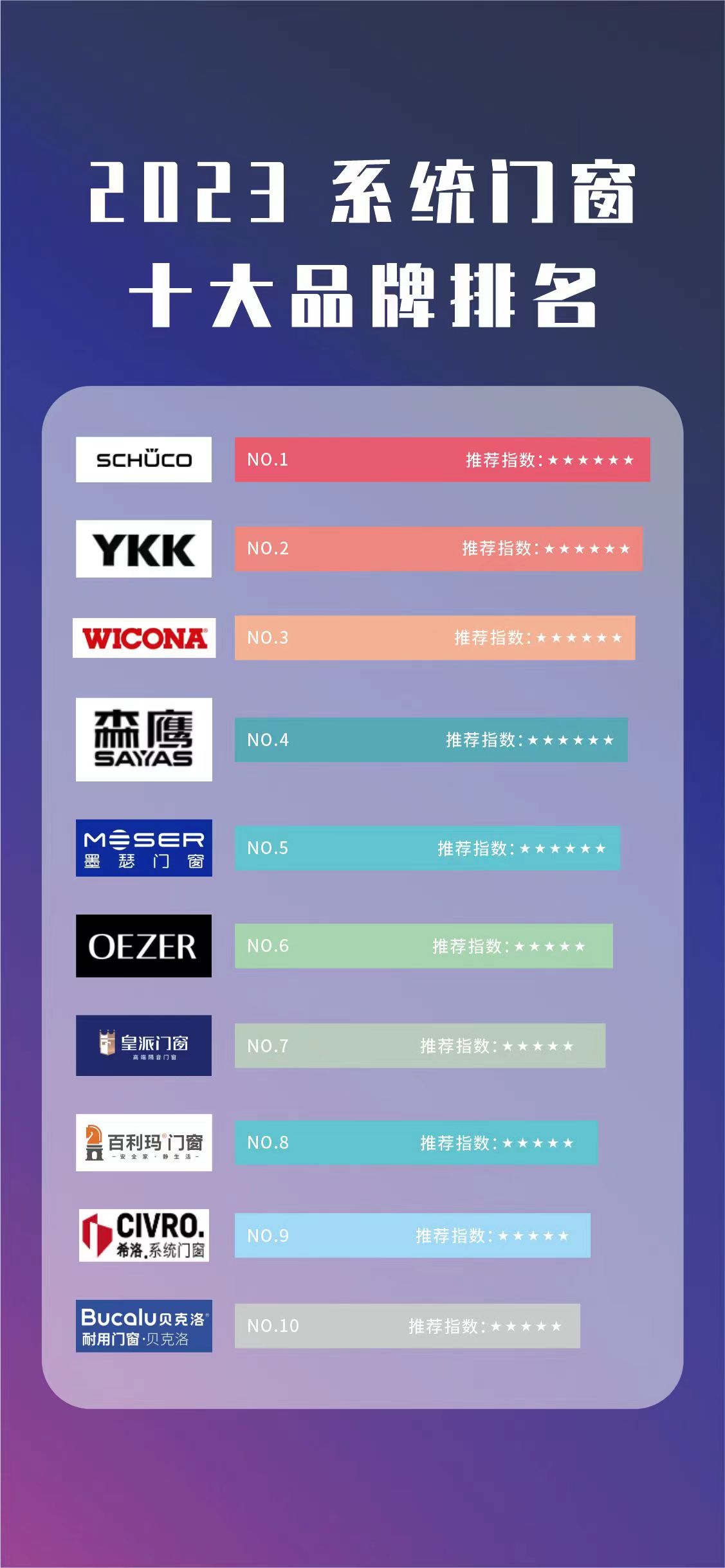 2023系统门窗十大品牌(一线榜单)上榜品牌有:旭格门窗、YKK门窗、WICONA门窗、森鹰门窗、墨瑟门窗、欧哲门窗、皇派门窗、百利玛门窗、希洛门窗、贝克洛门窗等。