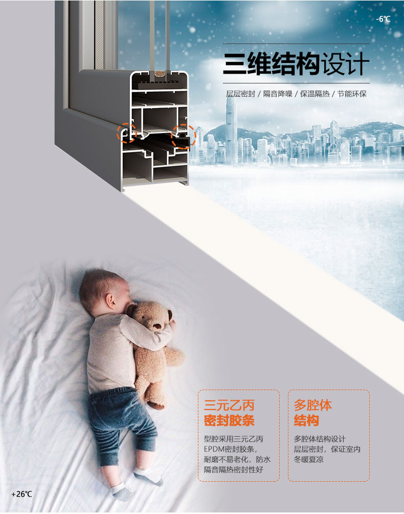 3、多腔体结构,三元乙丙密封胶条,层层密封