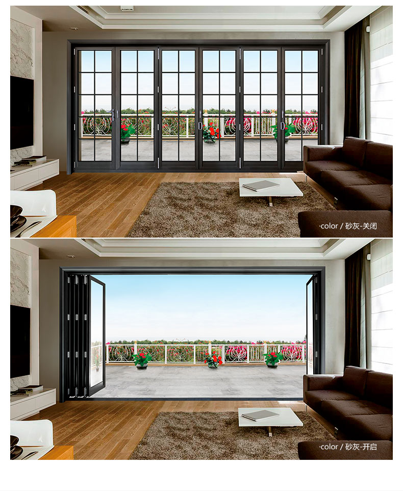 产品代码:#003系列名称:折叠门可选颜色:外色:象牙白、氟碳黑银、氟碳香槟、砂灰、咖啡黑内色:巴西花梨、印度紫檀、红樱桃、柚木色、海南黄花梨、 白橡木、象牙白、氟碳香槟、氟碳黑银、砂灰、咖啡黑特点: