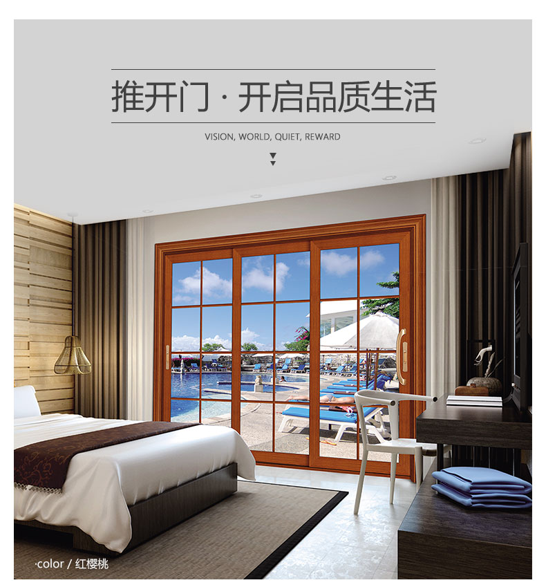 产品代码:#001系列名称:推拉门可选颜色:外色:象牙白、氟碳黑银、氟碳香槟、砂灰、咖啡黑内色:巴西花梨、印度紫檀、红樱桃、柚木色、海南黄花梨、 白橡木、象牙白、氟碳香槟、氟碳黑银、砂灰、咖啡黑特点: