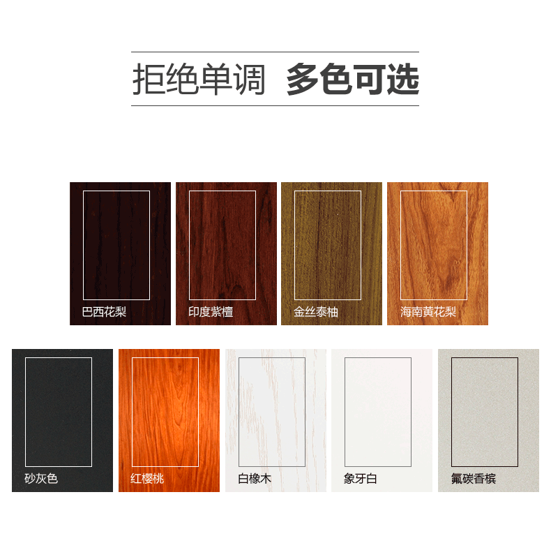 内色:巴西花梨、印度紫檀、红樱桃、柚木色、海南黄花梨、 白橡木、象牙白、氟碳香槟、氟碳黑银、砂灰、咖啡黑