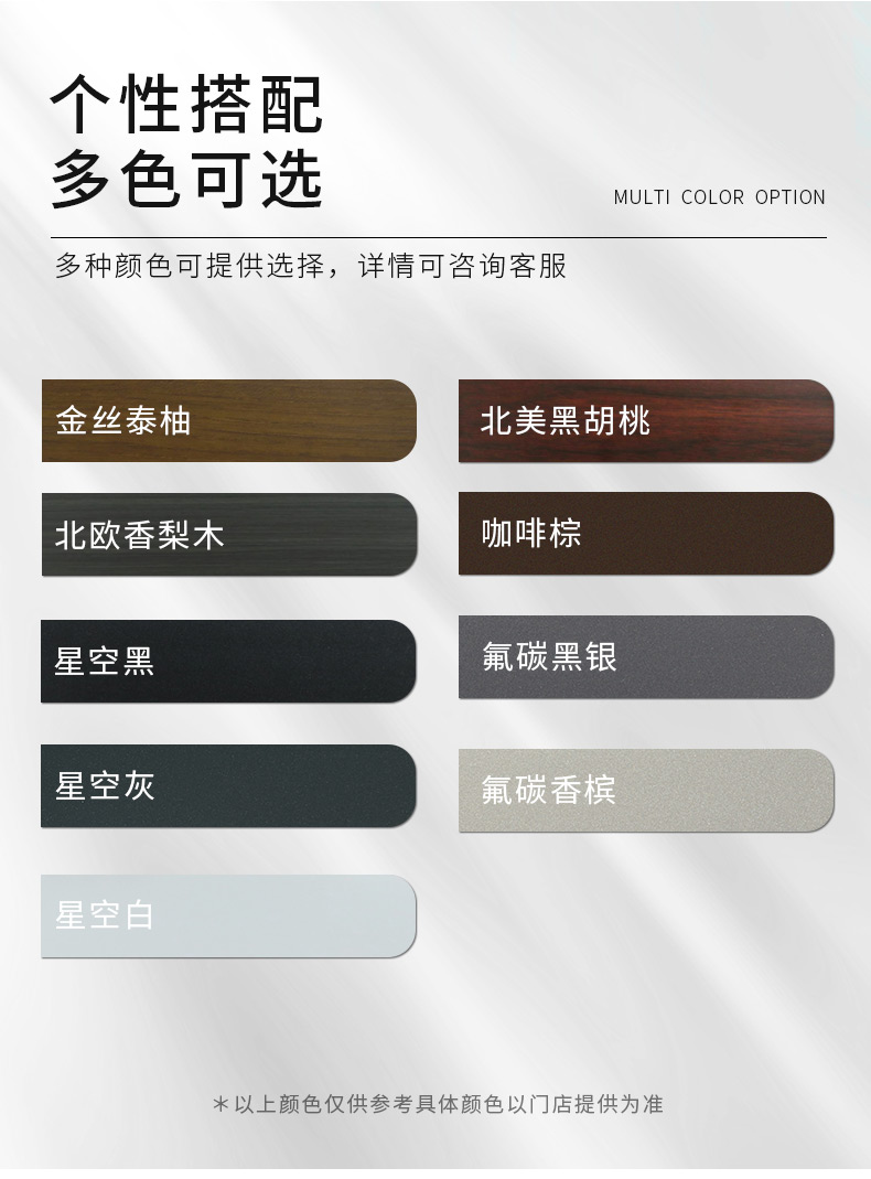 内色:巴西花梨、印度紫檀、红樱桃、柚木色、海南黄花梨、 白橡木、象牙白、氟碳香槟、氟碳黑银、砂灰、咖啡黑