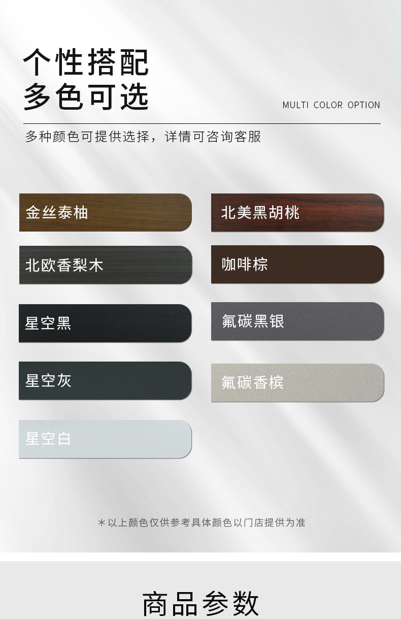 内色:巴西花梨、印度紫檀、红樱桃、柚木色、海南黄花梨、 白橡木、象牙白、氟碳香槟、氟碳黑银、砂灰、咖啡黑